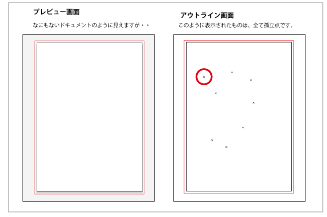 文字ツールで画面をクリックし、何も入力せずに別のツールに切り替えたり、パスのアンカーポイントの消し忘れなどで残ってしまった点を、「孤立点」といいます。