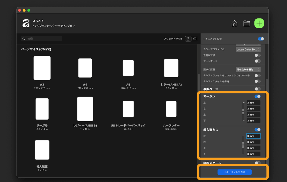 設定が完了したら「ドキュメントを作成」をクリックして印刷データを作成します。