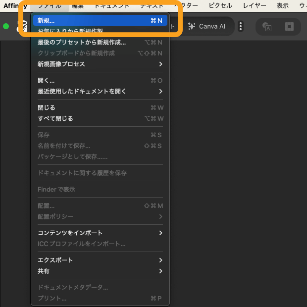新規ドキュメントを作成します。「ファイル」→「新規...」を選択。