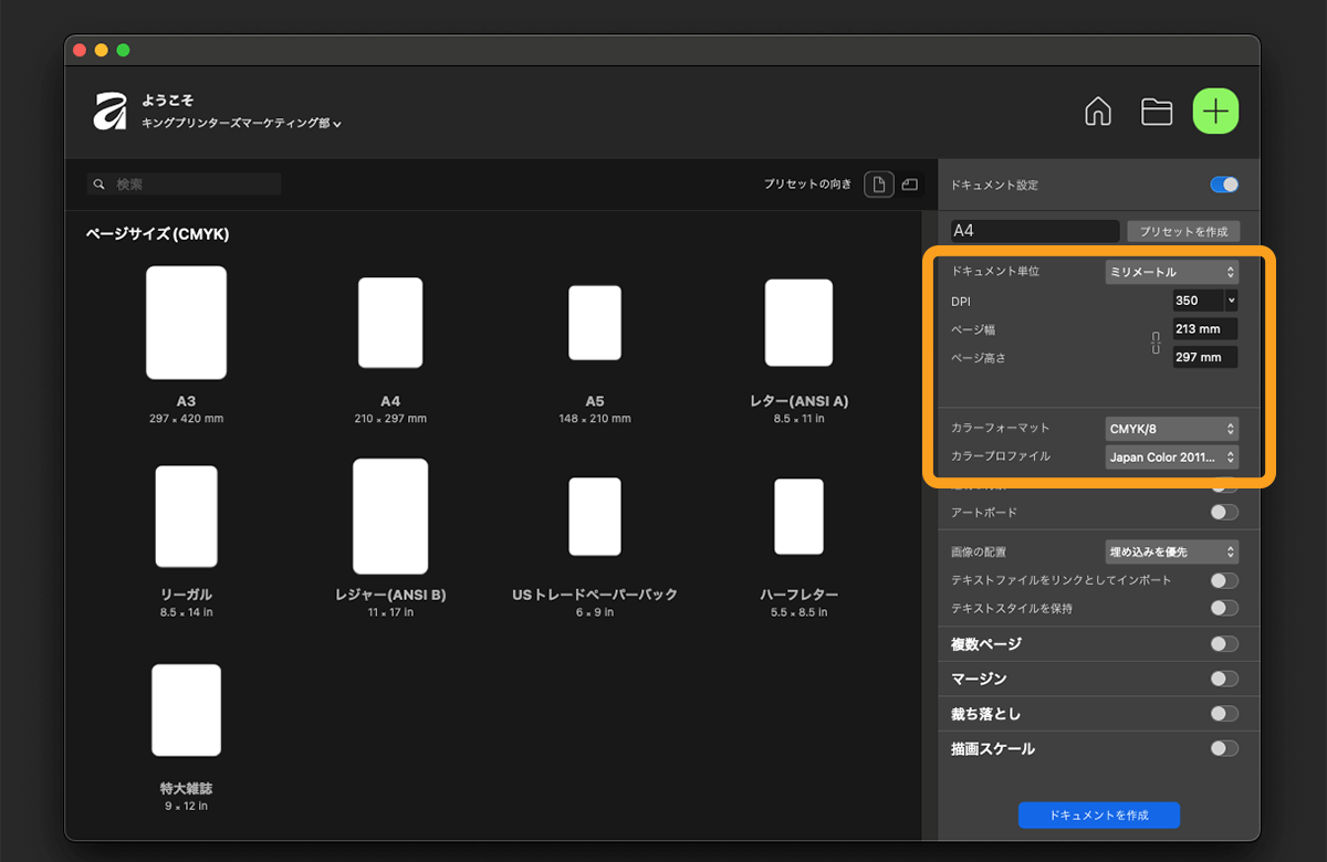 カラーフォーマット:CMYK/8(フルカラー印刷の場合)、グレー/8(モノクロ印刷の場合)を選択