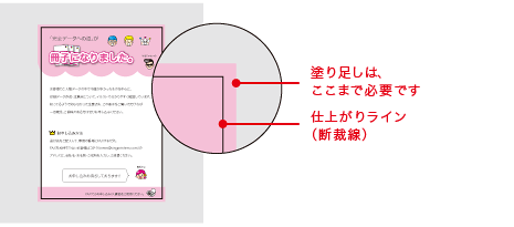 断裁位置(仕上がりサイズ)ギリギリにレイアウトされますと、断裁時に文字やデザインが切れてしまうことがあります。