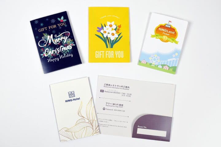 ルームナンバーやお客様の名前、チェックアウト時間などをフロントで手書きできるよう、マットコート紙・上質紙を使用しています。油性ペンやボールペンでの書き込みも問題ありません。