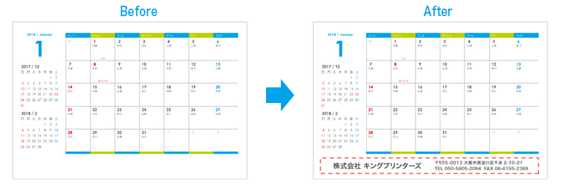 - 透明ケースカレンダーの下部やカード型カレンダーに、社名や店名、住所や電話番号、検索バーやURLを記載したり、ロゴマークを配置するだけであれば、無料にてデザインさせていただきます。
