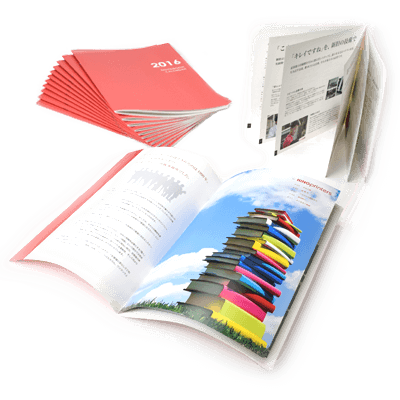 70kgという斤量の薄紙で印刷する中綴じ冊子が定番商品となりました。同じページ数であっても90kgや110kgなどの冊子より重さや、厚みが減りますので運搬時の運びやすさや送料など、様々な面でコストダウンにつながります。印刷工程や仕様などは90kg以上の中綴じ冊子と同じになります。
