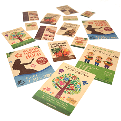 ネット印刷では珍しい「茶色のクラフト紙」を使って、チラシやフライヤーなどを10枚から格安で印刷いたします。ざらざらした「手触り」や見た目の「手作り感」から、どこか親しみやすい印象を与えてくれるクラフト紙。ナチュラルで素朴な雰囲気を出したい時や、ふるさとや自然をイメージさせるご案内におすすめです。