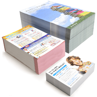 広告宣伝に使われる一般的なフライヤー・チラシを国内の自社工場で印刷して日本全国に発送いたします。100枚の小ロットでも高品質オフセット印刷だから、オフィスのカラーコピーやご家庭のプリンタに比べてとっても色鮮やか。良質の国産紙を中心に使用しているため、品質に関しても安心してご利用いただけます。