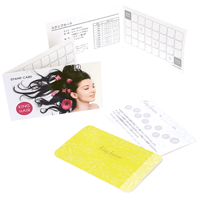 飲食店や美容サロンのスタンプカードを最少ロット100枚から格安で印刷いたします。定番の名刺サイズやお財布に入るクレジットカードサイズはもちろん、2つに折って使用する「倍サイズ」も作成可能です。お選びいただける4種類の厚紙はスタンプを押印した際にしっかりとインクを吸収する紙だけを厳選しています。