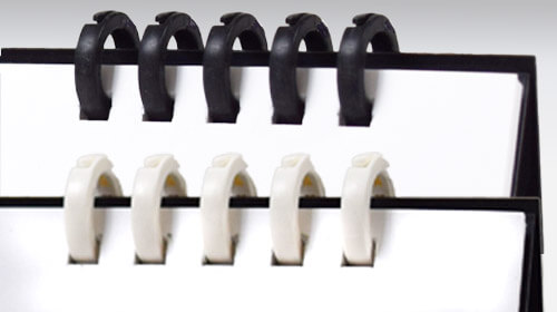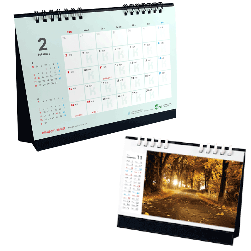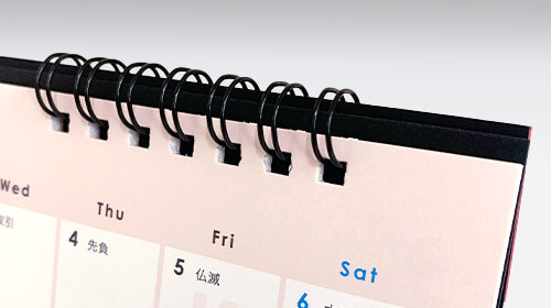 オリジナルデザインのリング綴じカレンダーを100個から作成いたします。表紙1枚と12ヶ月分のカレンダーの計13枚をリングで綴じた実用的な卓上カレンダーです。リング部分は耐久性に優れた「ワイヤーリング」と、環境に配慮した「eco紙プラリング」からお選びいただけます。納品時は台紙部分を折りたたみ、透明のOPP袋に入れてお届けいたします。