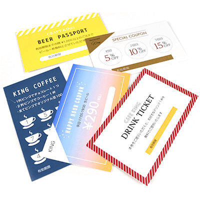飲食店や美容室などの様々なお店でお使いいただけるクーポン券を短納期かつ低価格で印刷いたします。お財布にもすっきりと収まるコンパクトなカードサイズ。紙の厚みは薄紙70kgから厚紙220kgまで幅広くご用意しているので、ご利用シーンに合ったものをお選びいただけます。「ナンバリング」加工にも対応しており、発行枚数の管理に便利。抽選券としてご利用いただくことも可能です。