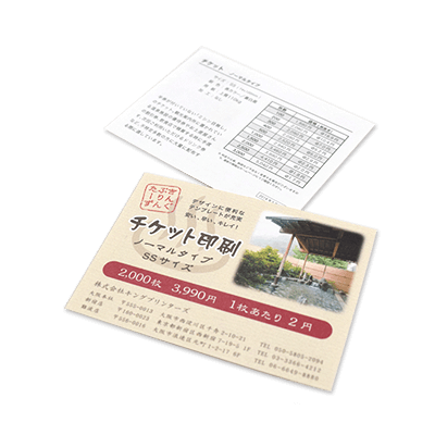 半券が付いていない「ミシン目無し」のチケット。観光案内所に置かれている温泉施設の優待券やお土産屋さんの割引券、飲食店で精算する時に手渡す、次回ご利用いただけるドリンク券や割引券など、不特定多数の方に大量に配布するタイプです。