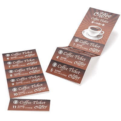 1枚ずつ切り離して使えるようにミシン目加工が施された回数券を100枚から印刷いたします。ミシン目が5本入った6枚綴りは高額な商品やサービスに、ミシン目が10本入った11枚綴りは1枚あたり数百円程度の券に適しており、どちらもコンパクトに折り畳みやすく、お財布にもスッキリ収納できるのも大きな特徴です。