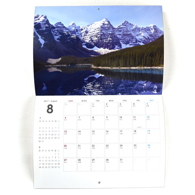 中綴じ冊子型のオリジナルカレンダーを全ページフルカラー印刷で100部から作成いたします。このカレンダーの特徴は壁掛けカレンダーの中でも唯一「カレンダーを半分に折り畳める」ことです。そのため、配布や送付に適しているだけでなく、使い終えたカレンダーを保管する際もコンパクトで場所をとりません。