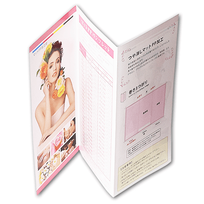 紙の長辺を均等に3分割し、片側の面を真ん中方向に、もう一方の面を裏側に折ったパンフレット。8種類のサイズ、11種類の用紙から目的や用途に合わせてお選びください。デザイン次第では、2つの表紙、2つの見開きページができることから、2種類の異なる内容を「はっきりと区別」して伝える場合におすすめです。