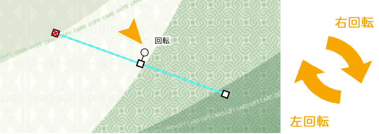 文字が選択された状態で、テキストボックスの少し上にある「◯」にマウスをのせると「回転」という文字が現れ、クリックしたまま左右に動かすと【テキストボックス】の中央にある「✕」を支点に文字を傾ける(斜めに配置する)ことができます。