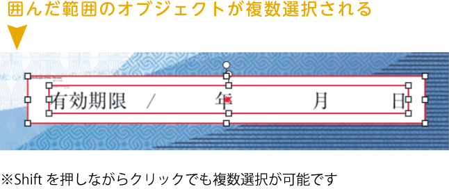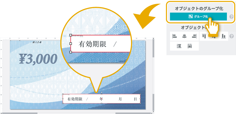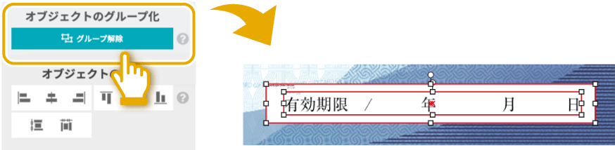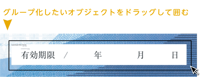 グループ化したオブジェクトを含む「グループ化」も可能です。※既成封筒テンプレートでの編集のときは不可