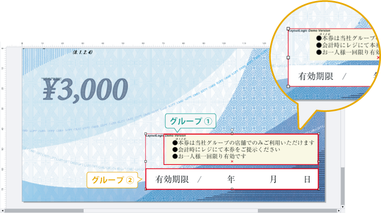 ワンクリックで背景のデザインを差し替えることができます。カラーバリエーションやデザインパターンをはじめ、金券においては金額の部分だけを変更したり、DMはがきにおいては切手枠のデザインを変更することも可能です。用途別のチラシ、大人用と子供用のチケット、金額が異なる金券をデザインする際にたいへん便利な機能です。