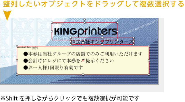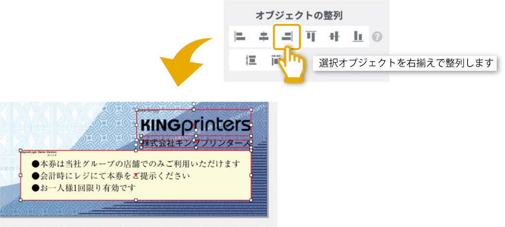 複数の文字や図形などのオブジェクトを選択して「オブジェクトの整列」のいずれかをクリックすると、選択したオブジェクトが任意の揃えで整列します