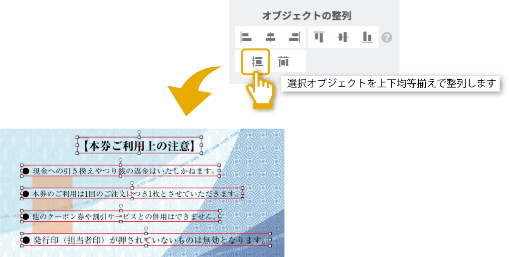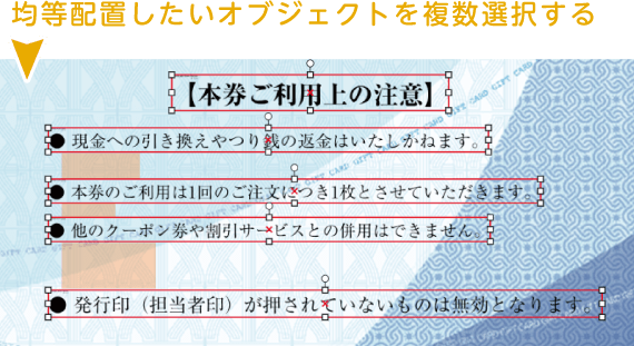 | 上下均等揃え | 選択したオブジェクト同士の上下間隔を均等に揃えます |