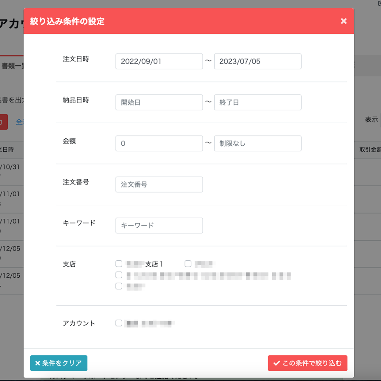 書類一覧画面に表示したい支店にチェックを入れて絞り込みが可能です - アカウント