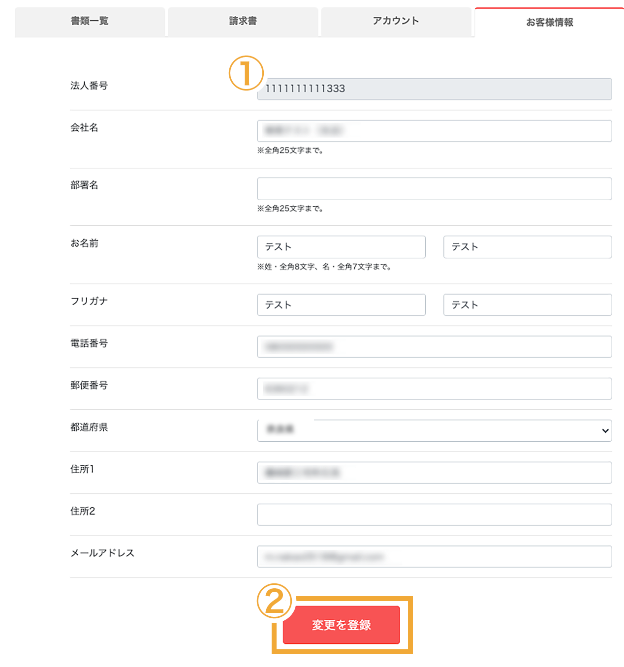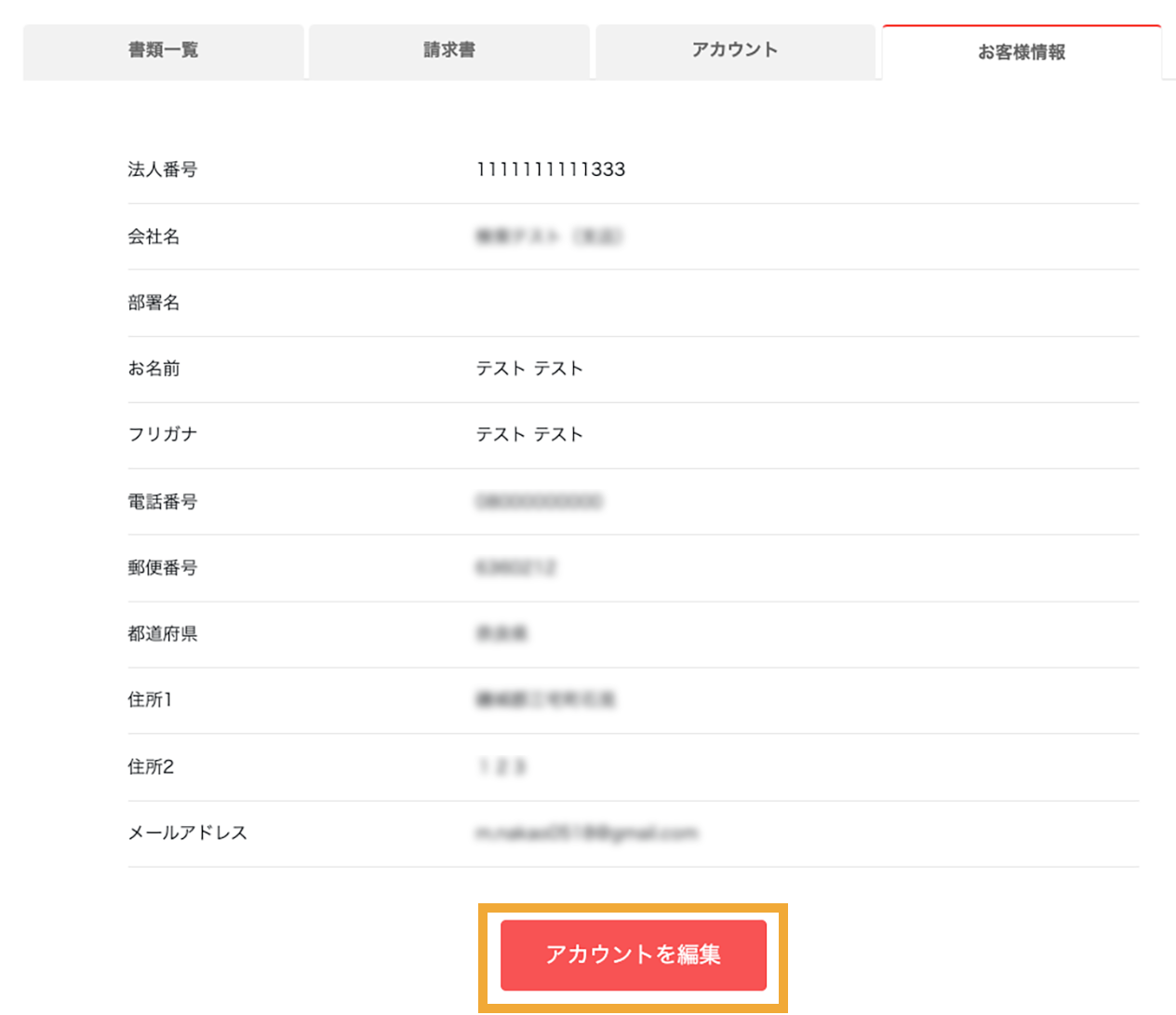 事業者アカウント→お客様情報タブをクリックすると画面が表示されます。