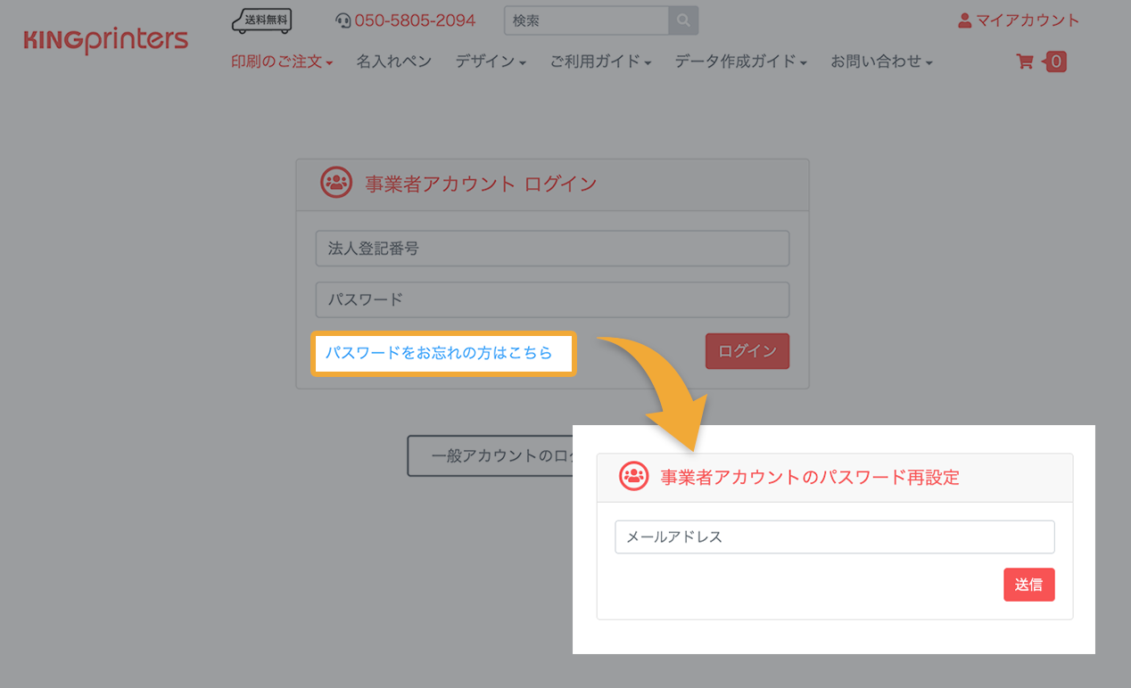 法人単位でマイアカウントを管理するため、事業者さま専用にキングプリンターズが発行したアカウントです。主な機能は以下の通りです。