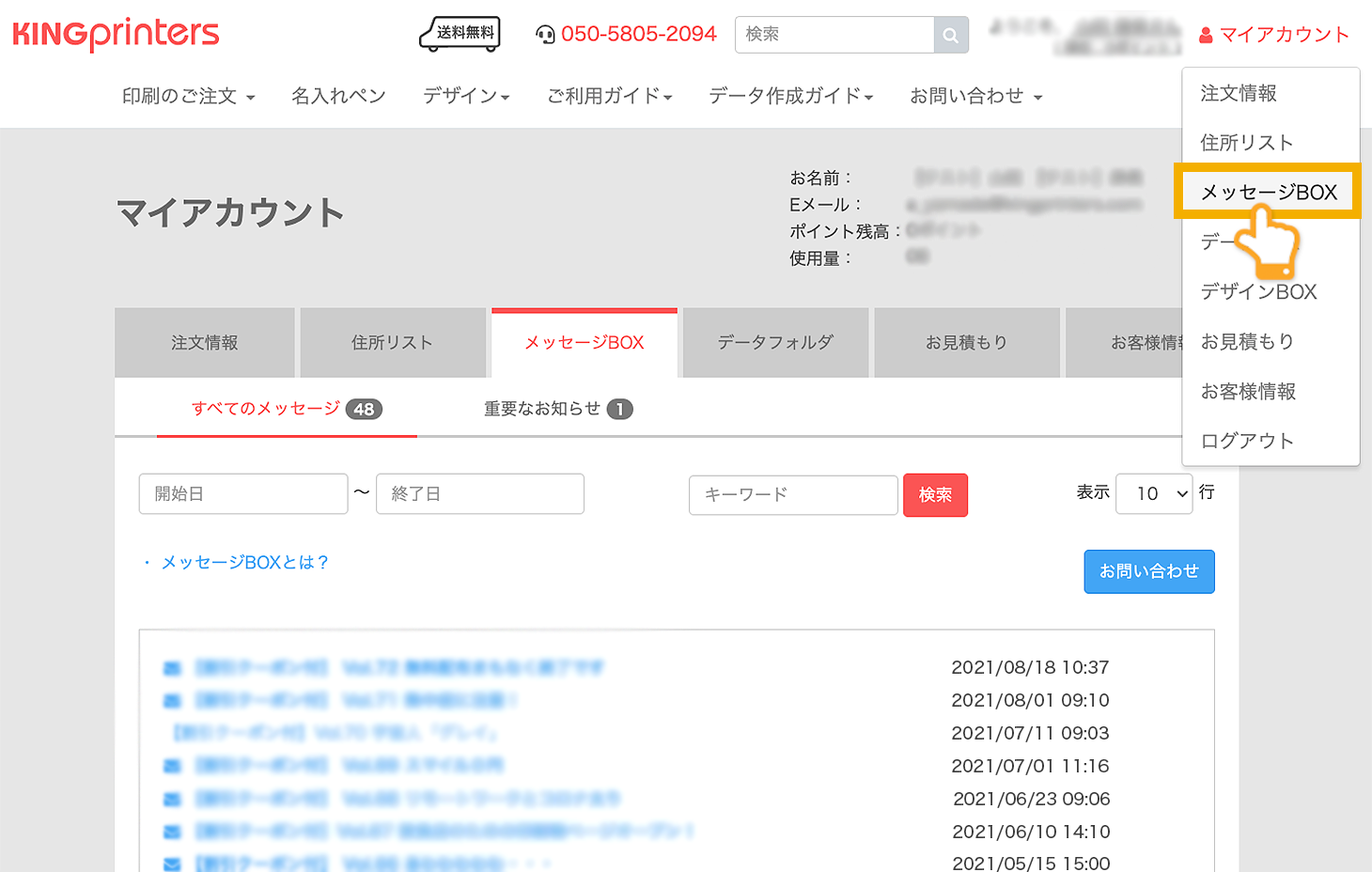 「マイアカウント > メッセージBOX」をクリックしてください。